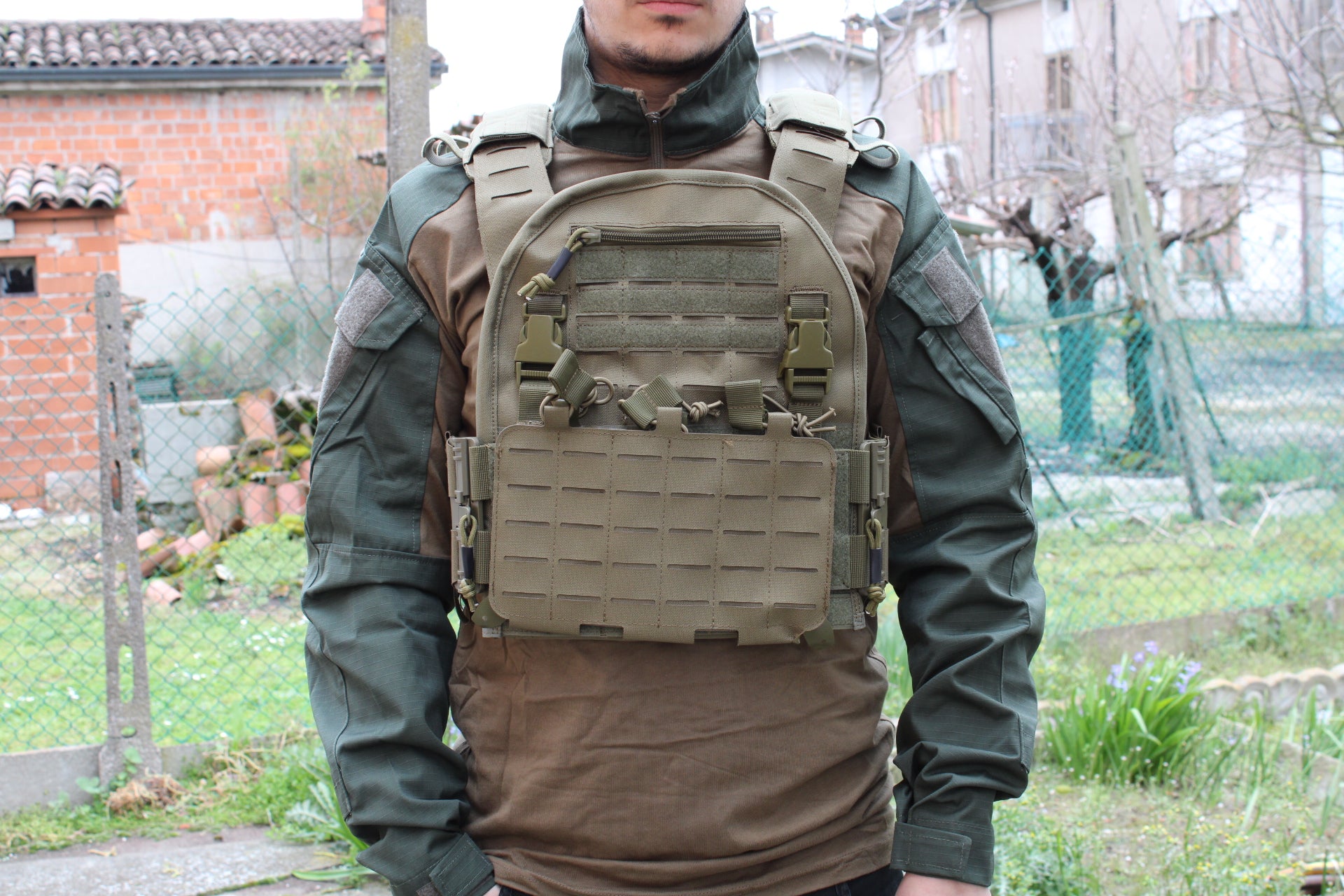 - Due pannelli anteriori - due pannelli inclusi, uno semplice per consentire qualsiasi configurazione di tasche e l'altro con tre tasche porta caricatori integrate.